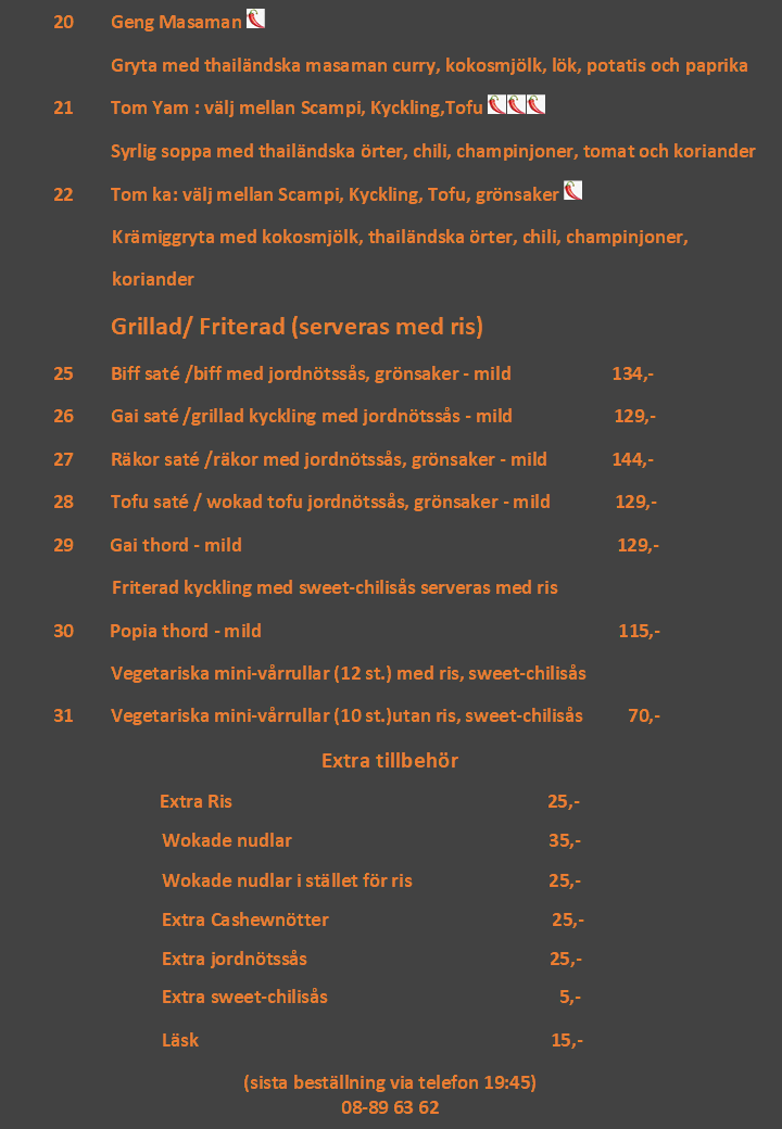 Ni kan beställa online genom att tryka på beställ online knappen och ni hämtar själva. Vill ni ha mat till din dörr? beställa via Foodora.